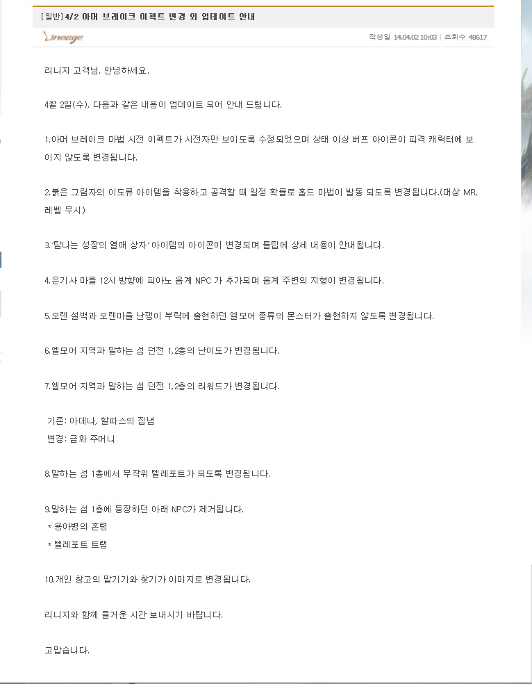 다엘관련 리니지 본섭 업데이트가 완료되었네요. 페이지 정보 작성자 빛소리 쪽지보내기 자기소개 아이디로 검색 전체게시물 쪽지보내기 자기소개 아이디로 검색 전체게시물 댓글 0건 조회 3,616회 작성일 14-04-03 01:41 본문 리니지 본섭관련 내용이네요 ㅎㅎ사랑서버에도 업데이트가 적용이 되려나요 ㅎㅎ 추천0 비추천0 목록 이전글공성관련 14.04.03 다음글접속 못한지 넘 오래 됐네요 ㅎㅎ 14.04.02 댓글목록 댓글목록 등록된 댓글이 없습니다.